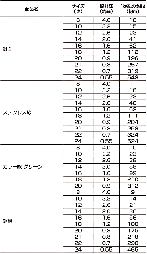 針金の規格 太さ 重さ 長さ